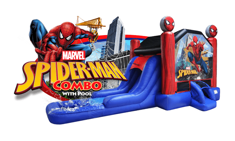 The Spider-Man 4 in 1 Combo with Pool is great for any Marvel themed event. This inflatable is combined with the following, 1) Bouncing, 2) Climbing, 3) Basketball Hoop, 4) Waterslide and 5) Pool. This celebrated combo is sufficient for participants to test their spider-man abilities.