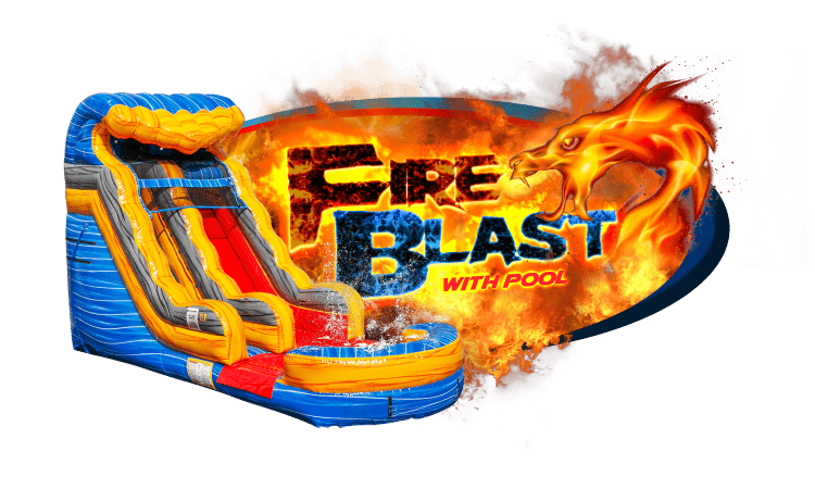 This beautiful red, blue and yellow marble fire blast water slide is one of the newest additions to our water slide family. This 16ft high, 25ft long slide comes with a great big pool and is great for all ages. It's the perfect slide for a summer cool down! Call today or reserve online.