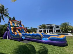 Dive into a world of fun with the 25ft Tiki Plunge Double Lane w/Splash Pool. This rental features two exciting lanes for simultaneous bouncing adventures and a refreshing splash pool to cool you off, creating an unforgettable play experience for any event.